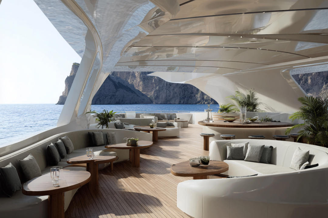 Exterior spaces at this scale are never only visual. They frame arrival, hosting, relaxation and the way the yacht is experienced socially on the water.